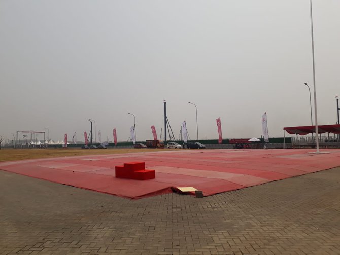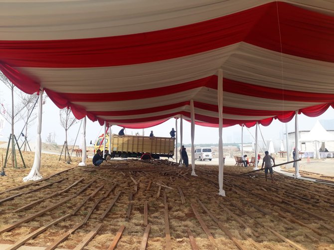 INFOKIUKIU - Satu hari menjelang HUT RI ke-74, lapangan di Kawasan Pantai Maju, Pulau Reklamasi, Jakarta Utara dipenuhi atribut upacara seperti podium, tenda dan karpet merah. Anto selaku Koordinator Lapangan dari Jakpro menyatakan, tempat yang luasnya lebih dari 1.000 meter persegi ini akan menampung sekitar 8 ribu Pegawai Negeri Sipil, termasuk 300 undangan VVIP dan VIP.